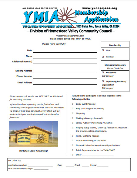 The Yucca Mesa Improvement Association is a membership driven 501c3 not funded by the state, county, or city. We depend on annual membership dues to keep the lights on, the A/C that cools us, the propane that warms us, and general property maintenance and insurance.